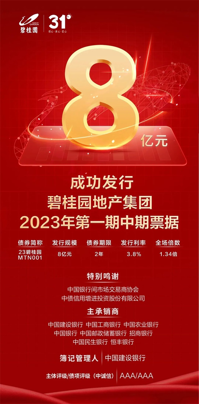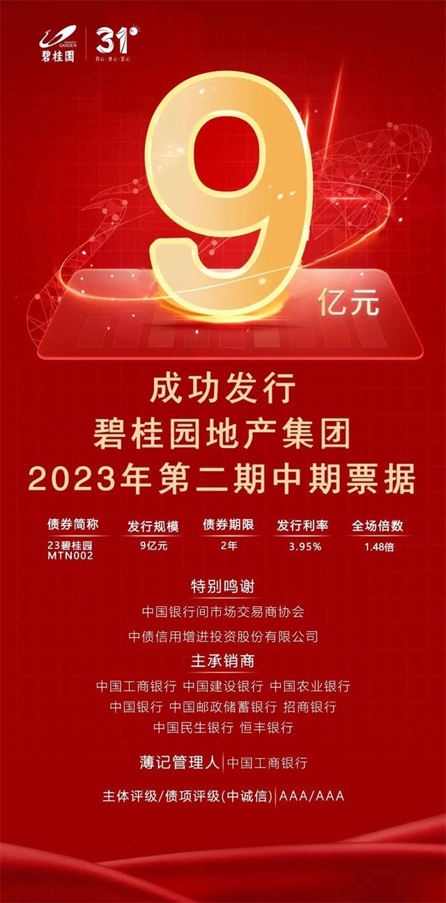 浏览量:7091 5月8日晚间,碧桂园地产成功发行两期中期票据,由中债信用增进公司提供全额无条件不可撤销的连带责任保证担保。公开数据显示,2023年度第一期(23碧桂园MTN001)票据额度为8亿元、2023年度第二期(23碧桂园MTN002)票据额度为9亿元,发行期限均为2年,最终票面利率分别为3.80%、3.95%。